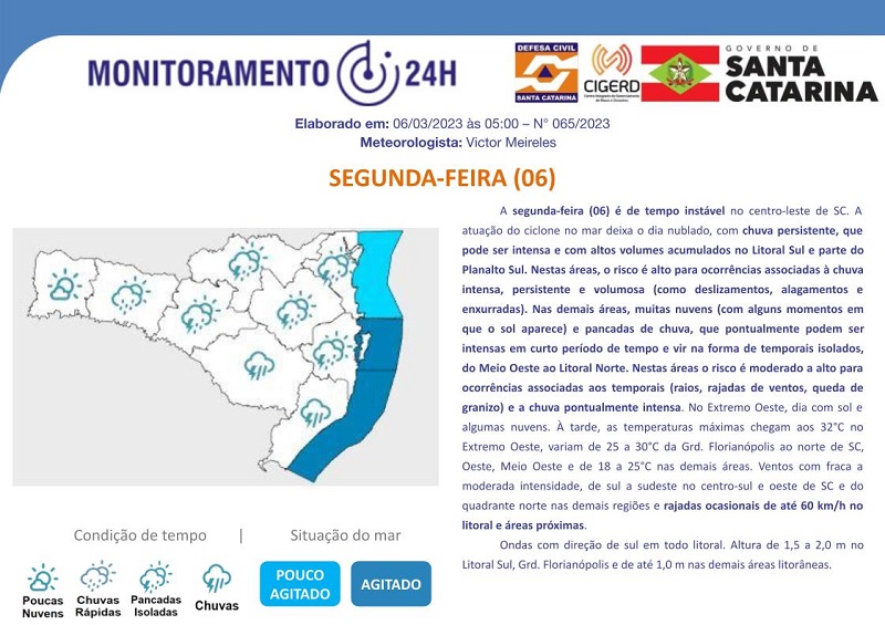 O boletim informativo da Defesa Civil do estado alerta para a atuação de um ciclone no mar. “A atuação do ciclone no mar deixa o dia nublado, com chuva persistente, que pode ser intensa e com altos volumes acumulados no Litoral Sul e parte do Planalto Sul”, diz o documento, que ainda alerta para a possibilidade de problemas na região. “Nesta áreas, o risco é alto para ocorrências associadas à chuva intensa, persistente e volumosa (como deslizamentos, alagamentos e enxurradas)”, prevê a Defesa Civil.